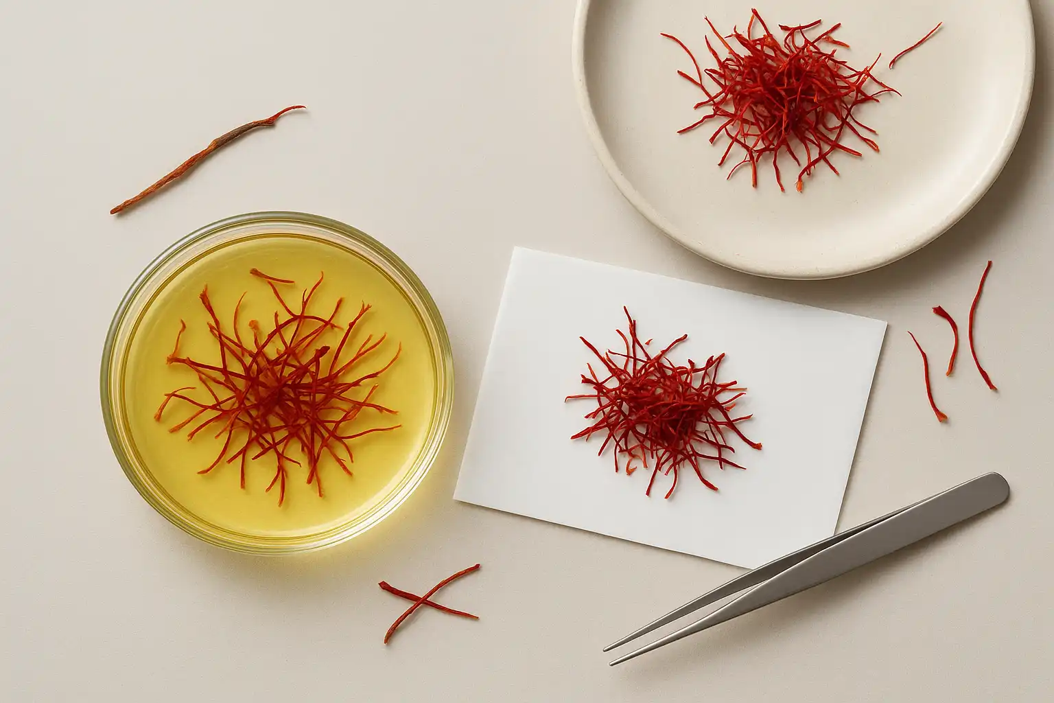 زعفران اصل دارای کلالههایی است که کاملاً قرمز هستند و انتهای آنها کمی خمیده و قیفیشکل میباشد. کلالههای زعفران اصل، باریک، منظم و بدون الیاف اضافی یا رگههای سفید هستند. نمونههای تقلبی معمولاً ضخیمتر، رشتهای یا همراه با الیاف بیگانهاند. بهتر است قبل از هر تست دیگری، یک بررسی بصری داشته باشید.