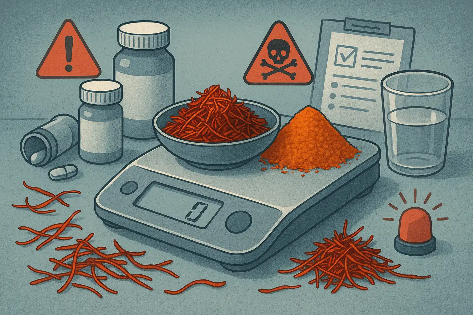 مصرف بالاتر از ۵ گرم زعفران در روز میتواند منجر به بروز مسمومیت شود. در دوزهای بالاتر (حدود ۱۲ تا ۲۰ گرم) خطر شوک، خونریزی داخلی و حتی مرگ وجود دارد. اگر علاوه بر تهوع و استفراغ، خونریزی بینی، مشاهده خون در ادرار، ضربان نامنظم قلب یا یرقان بروز کرد، مراجعه سریع به درمانگاه یا اورژانس توصیه میشود. خانمهای باردار به دلیل خطر بالای تحریک رحم و ریسک سقط، باید نسبت به این نشانهها حساسیت بیشتری نشان دهند.