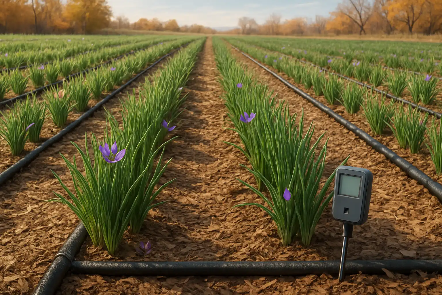 - آبیاری قطرهای: در این روش، آب به صورت مستقیم به ریشه پیاز زعفران رسانده میشود. این کار باعث میشود تا هدررفت آب به حداقل برسد و رطوبت دقیقاً در منطقه مورد نیاز گیاه تأمین گردد. تحقیقات نشان دادهاند که با اجرای آبیاری قطرهای در زمینهای زعفران، تا ۹۰ درصد در مصرف آب صرفهجویی میشود.